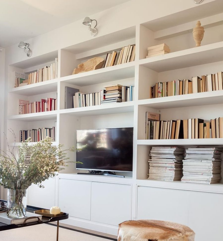 Aprovecha la pared del salón para instalar un armario empotrado sin puertas y colocar todos tus libros, darán a la estancia un aspecto elegante e interesante. También puedes optar por un armario con puertas si prefieres que no se vean.